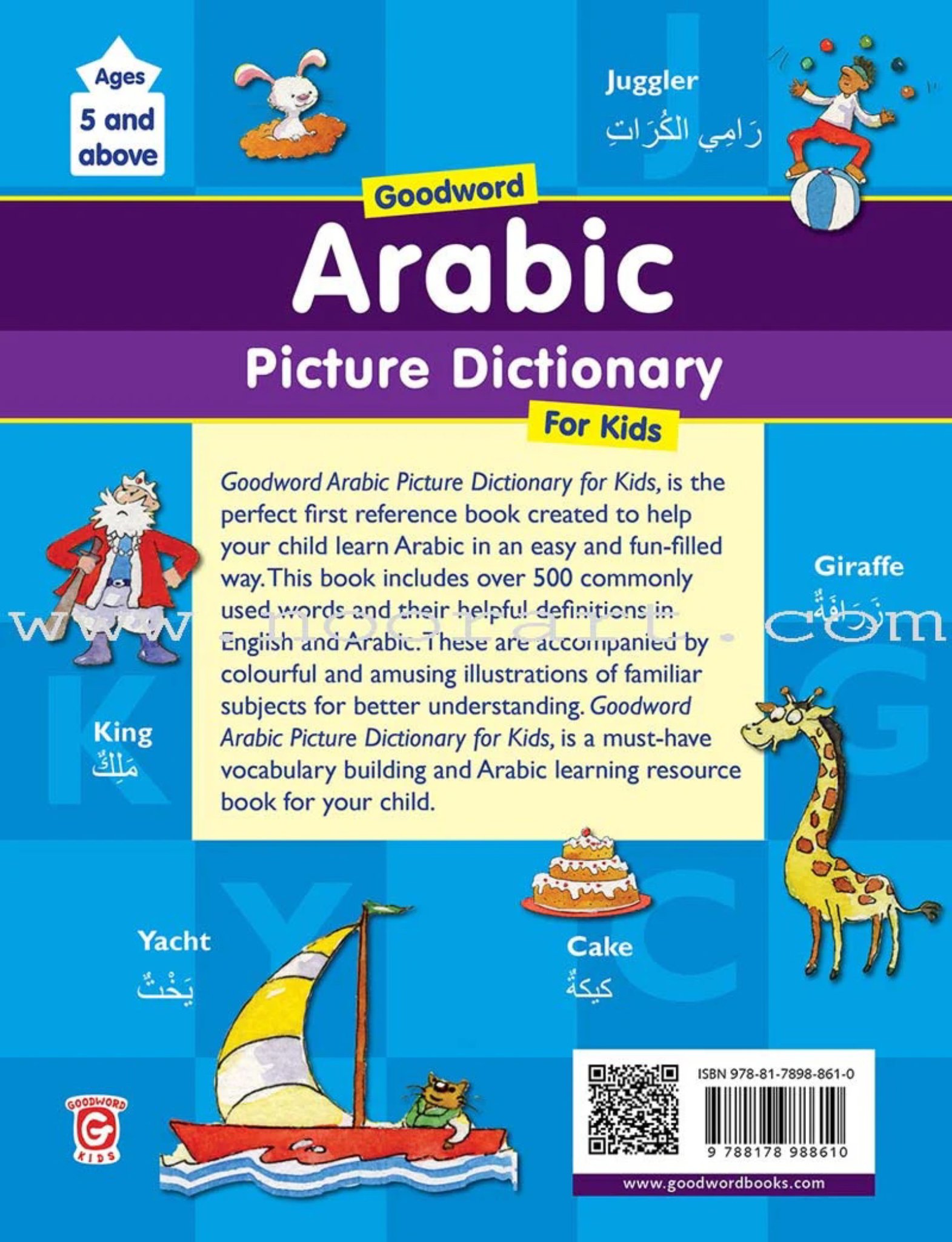 Goodword Arabic Picture Dictionary for Kids is a beginner-friendly reference book designed to help children learn Arabic vocabulary in an easy and engaging way. It contains over 500 commonly used words presented in both Arabic and English, supported by colourful illustrations of everyday objects and themes. The visual format helps children learn through association, making it an effective tool for early language development and vocabulary building.